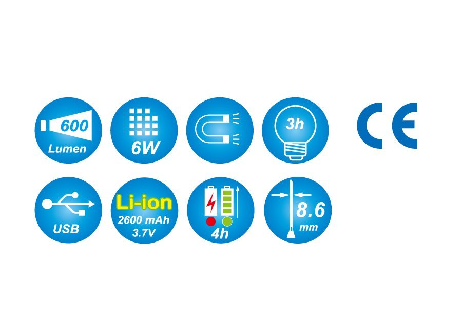 Brightness – Worklight : 600/250 Lumen (lm), Top light: 120 lumen (lm), white light color, kelvin : 6500K